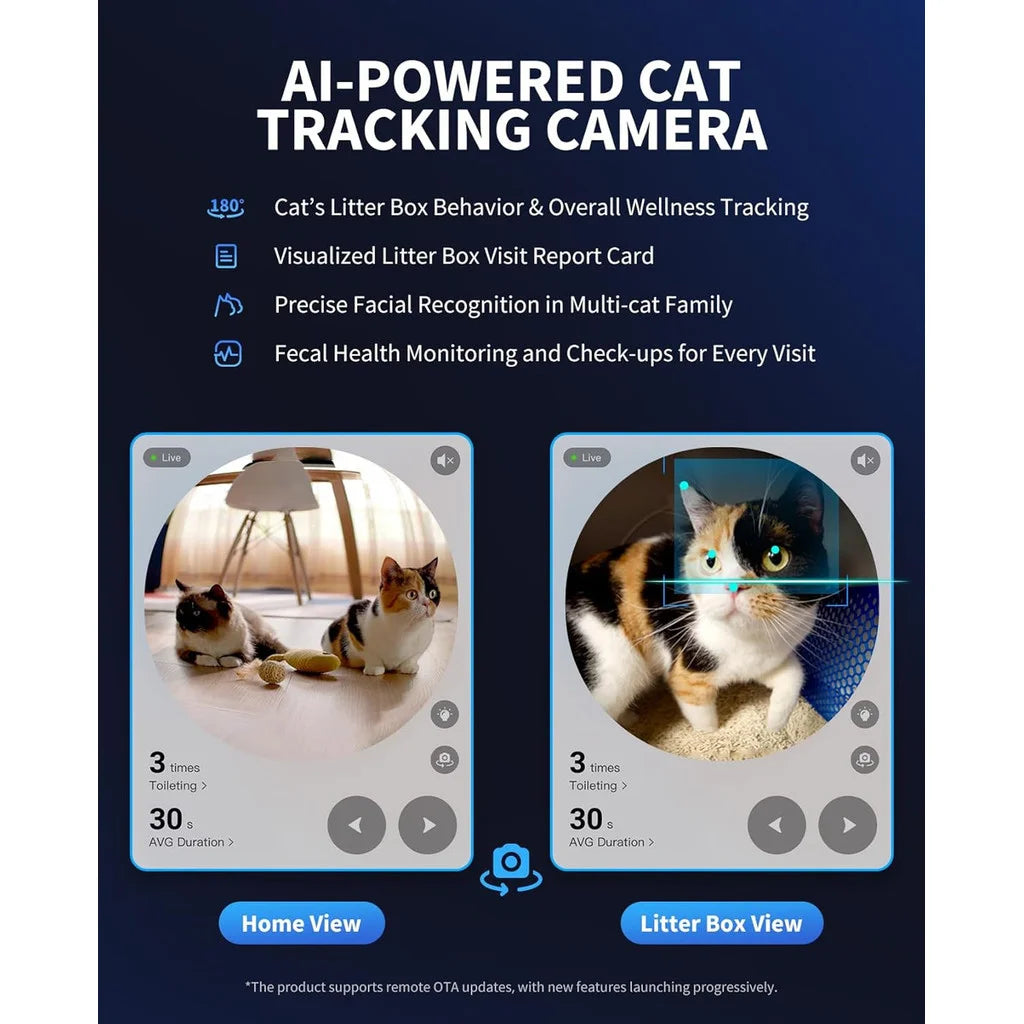 A caixa de areia autolimpante para gatos PETKIT Purobot Ultra apresenta uma câmera de alta resolução alimentada por IA com um ângulo de visão amplo de 210 graus e visão noturna infravermelha, permitindo que você veja seus animais de estimação em qualquer lugar, a qualquer momento, estejam eles na caixa de areia ou brincando em casa! A câmera giratória de 180 graus oferece rastreamento abrangente de 360 graus do comportamento do seu animal de estimação, é como ficar de olho nos seus amigos peludos.