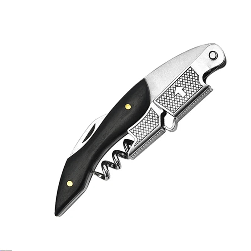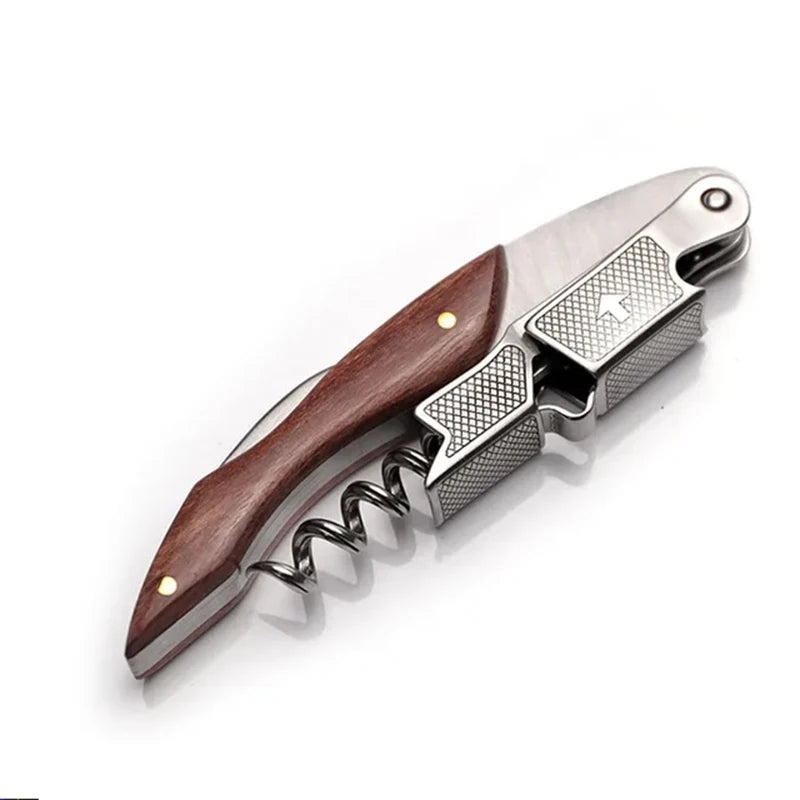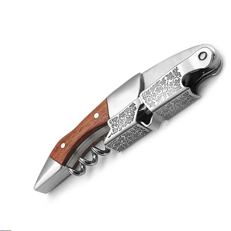 This corkscrew elegantly blends the characteristics of a wine corkscrew, bottle opener and foil cutter all together in a stylish wooden handle with comfort-grip. It inspires confidence and provides a fine tool's satisfying, strong height and feels good as a well-balanced kitchen knife in the hand.